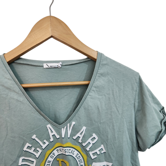 L.G.M חולצת טי בגזרת וי בהדפס ג’ינס משופשף | לאישה מידה L